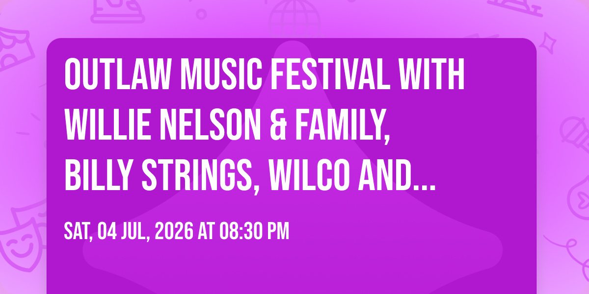📍 Location: 30.1329, -97.6406🎉 Welcome to Outlaw Music Festival with Willie Nelson & Family, Billy Strings, Wilco and more, where dreams come alive and possibilities are endless! 🏛️ Join us at Germania Insurance Amphitheater in the heart of Austin, TX for an event that defies expectations. 📅 On July 4th, 2026 at 08:30 PM, be part of something truly extraordinary as we bring together innovation, entertainment, and pure magic. ✨ Every aspect has been carefully designed to ensure an unforgettable experience for all our guests. Whether you're seeking adventure, inspiration, or simply a break from the ordinary, this event promises to deliver beyond your wildest dreams. 🎊 Prepare for a journey into the extraordinary!