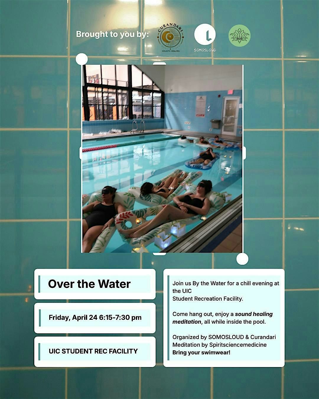 Join us for Over the Water for a chill afternoon at the UIC Student Recreation Facility. on April 24, 2026 at 6:15 PM (Central Time). Come hang out, enjoy a sound healing meditation, all while inside the pool.
