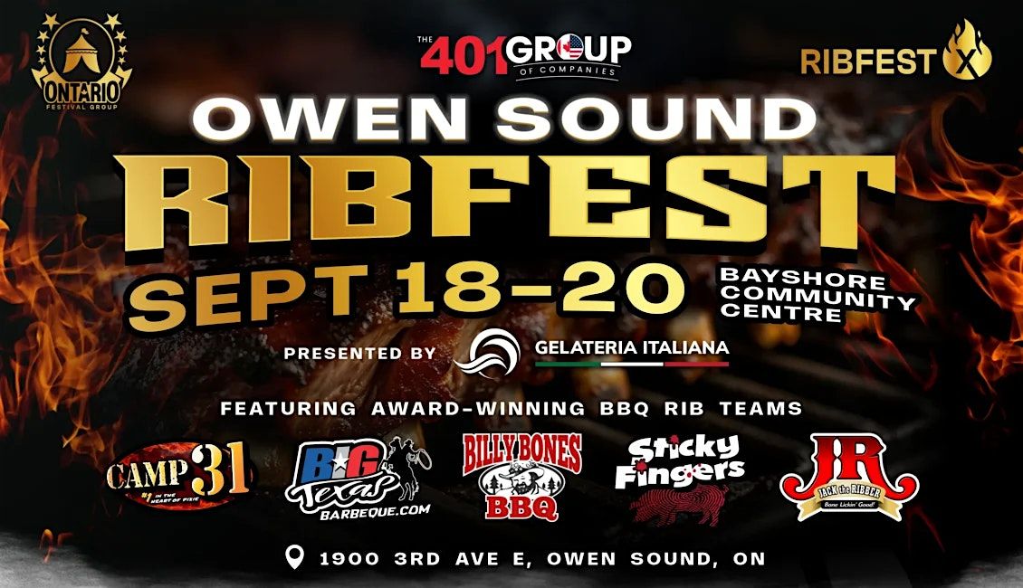 The 14th Annual Owen Sound Ribfest X 2026 is presented by Gelateria Italiana and will take place on Friday, Sept 18 to Sunday, Sept 20 2026, held at Bayshore Community Centre. Produced by Ontario Festival Group. We are bringing North America’s Best Rib Teams. These “Pitmasters” are ready to serve you and your friends Award-Winning, Mouth-Watering BBQ Smoked Ribs, Tender Pulled Pork, Juicy Smoked Brisket, BBQ Chicken, Smoked Sausage and those huge Beef “Dino” Ribs.