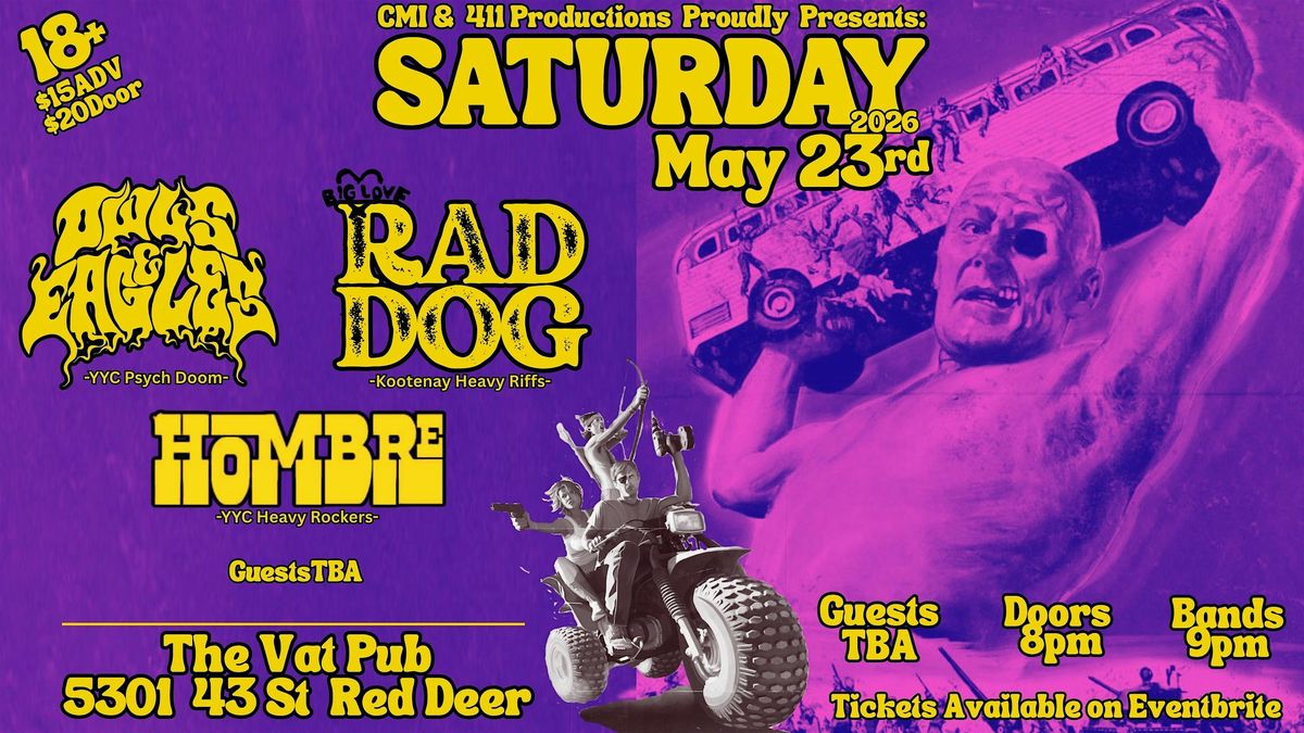 BC's Rad Dog and AB's Owls & Eagles are getting together for a quick run through the prairies. Being the second stop on this 3 day ripper is Red Deer, we decided its best we swing by the Legendary Vat Pub. But this time we brought Calgary Heavy riffers HOMBRE with us. and a suprise Red Deer opener!! Come one come all, and dont forget...The weekend forecast calls for heavy riffs, and good times.