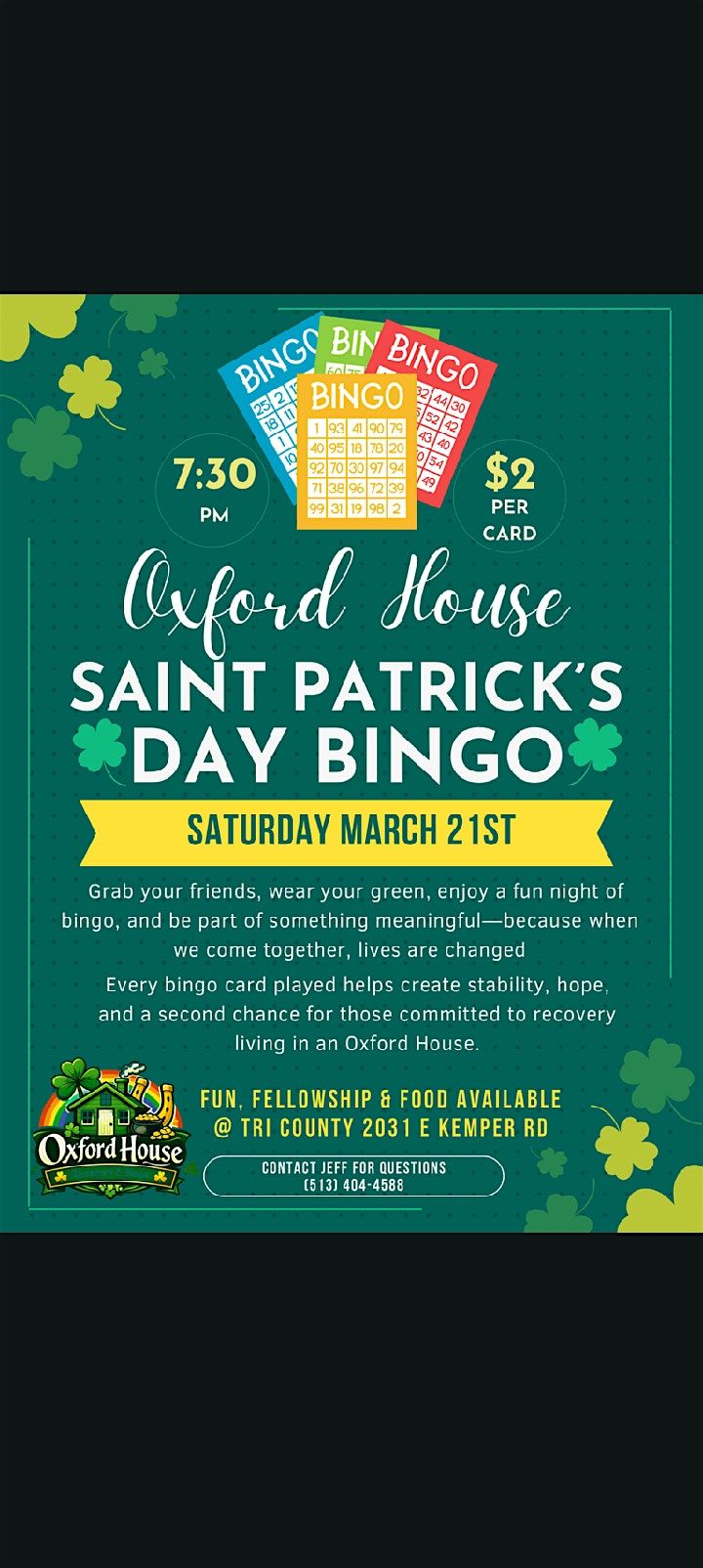 Join us in person for a fun-filled St Paddy's Day bingo night at Oxford House! It's the perfect chance to celebrate, score some cool prizes, and soak up those lucky vibes. Bring your friends, enjoy great company, and let's make this St Patrick's Day one to remember. Don’t miss out on the laughs and excitement — see you there!
