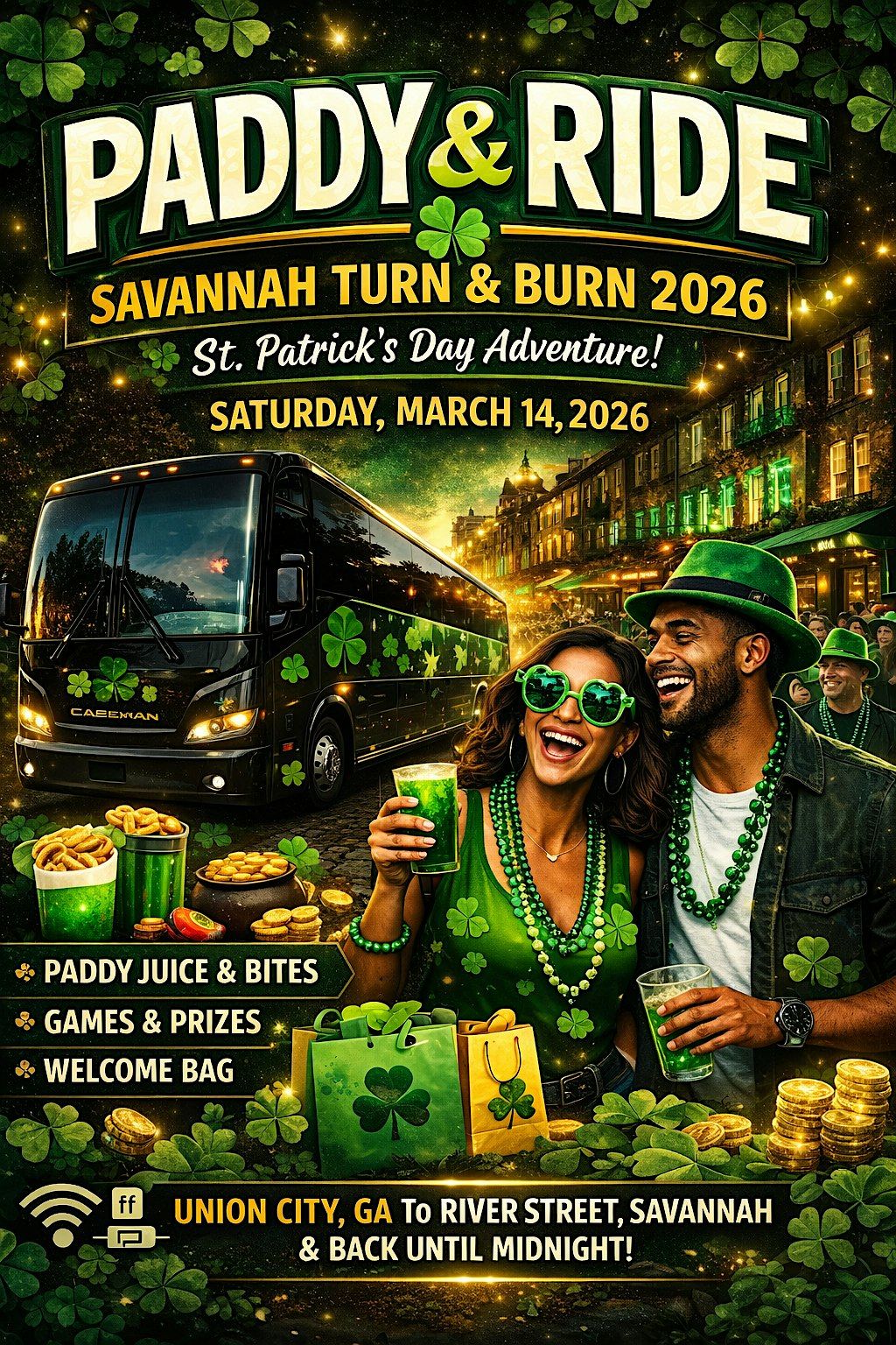 On Saturday, March 14, 2026, we’re loading up the bus and heading to River Street for one epic St. Patrick’s Day Turn & Burn experience.