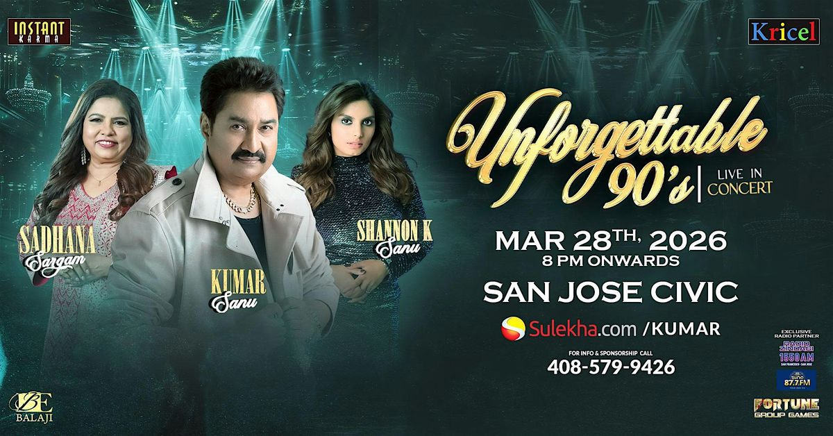 Legendary Kumar Sanu & National Award winner Sadhana Sargam live—timeless Bollywood hits at San Jose Civic, March 28.