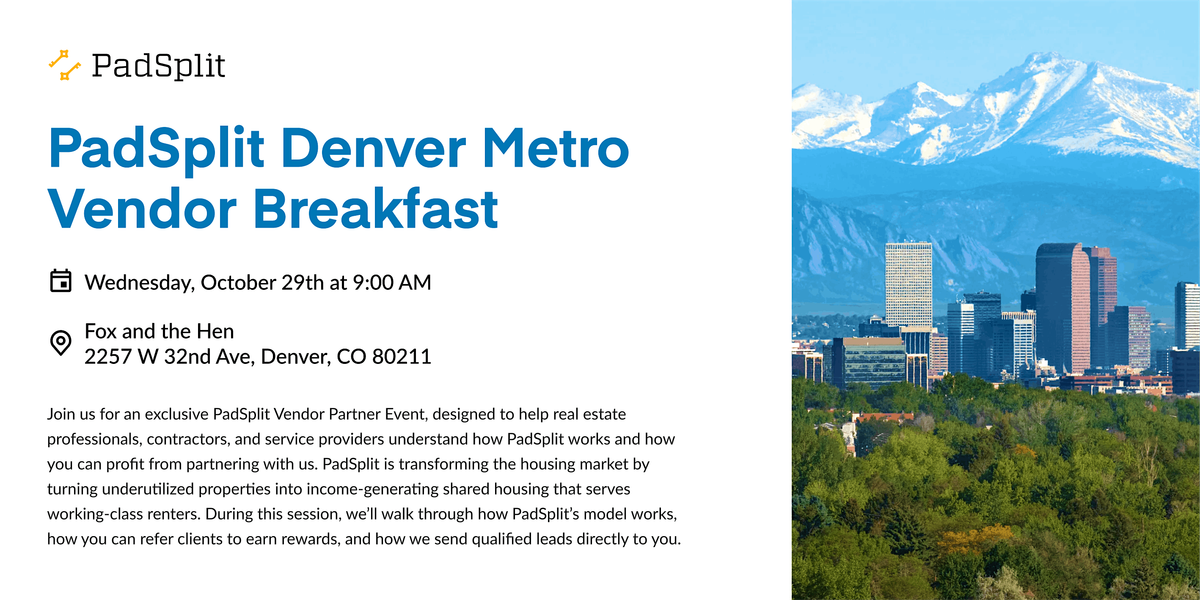 Join us for an exclusive PadSplit Vendor Partner Event, designed to help real estate professionals, contractors, and service providers understand how PadSplit works and how you can profit from partnering with us. PadSplit is transforming the housing market by turning underutilized properties into income-generating shared housing that serves working-class renters. During this session, we’ll walk through how PadSplit’s model works, how you can refer clients to earn rewards, and how we send qualified leads directly to you.