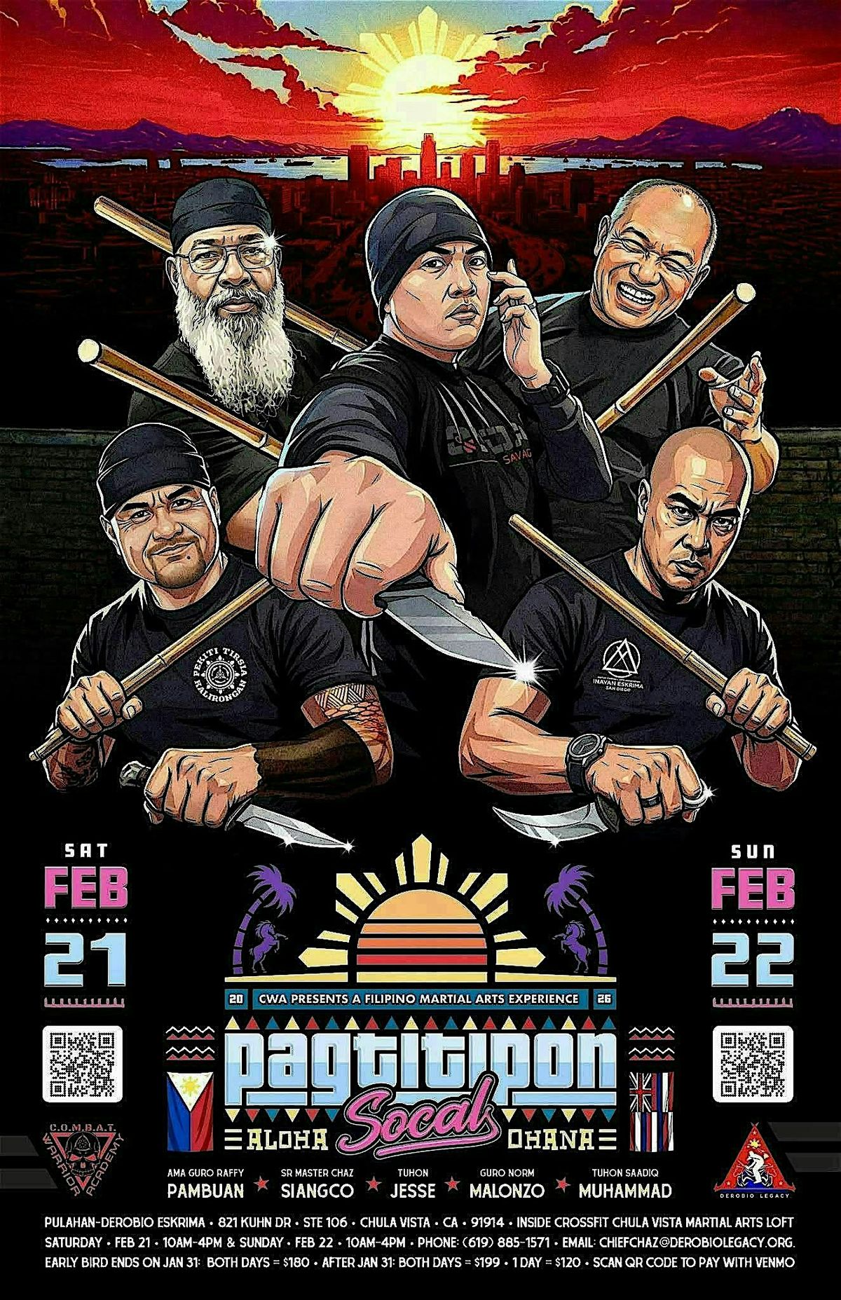 This two-day Collaboration Filipino Martial Arts (FMA) Seminar brings together respected instructors and lineages for an immersive weekend dedicated to the study, practice, and preservation of Filipino martial traditions. Hosted by Senior Master Chaz Siangco of Pulahan-Derobio Eskrima, the seminar emphasizes unity through diversity, shared learning, and the cultural roots that connect the arts.