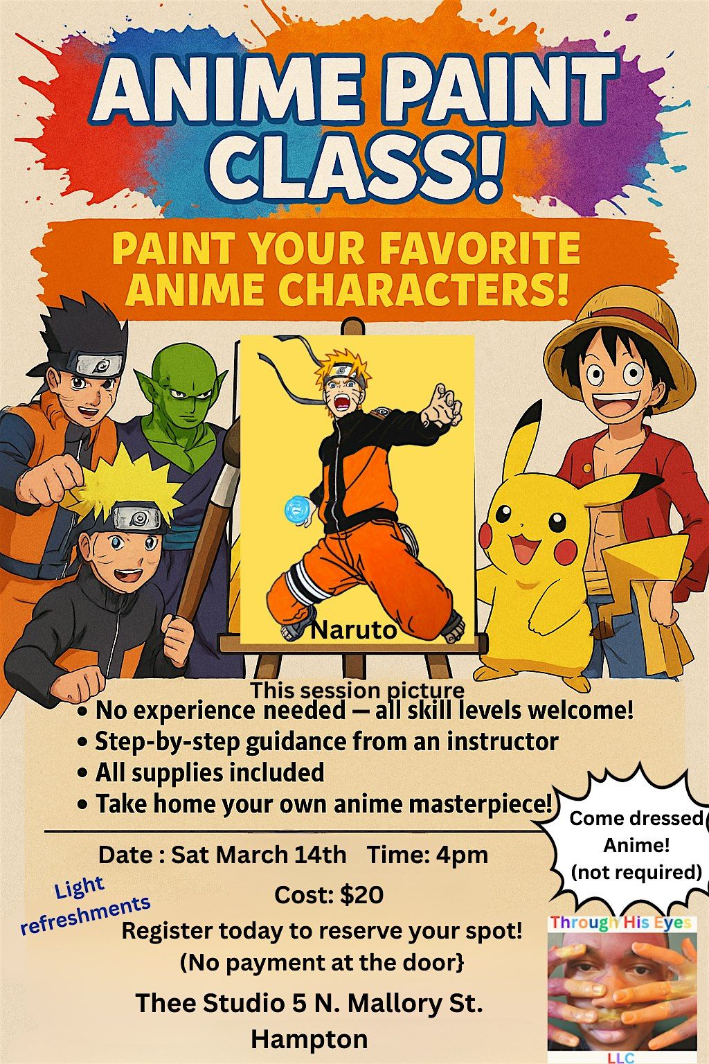 Join us at THEE STUDIO on March 14, 2026 at 4:00 PM (Eastern Time) for a fun and chill anime painting class! Whether you're a beginner or just wanna unwind with some creative vibes, this instructed class is the perfect spot to express yourself and meet fellow anime fans. Bring your energy and let's make some cool art together! You can also use this link to sign up and save on fees https://www.paypal.com/ncp/payment/H8CH3MQJRFXFQ