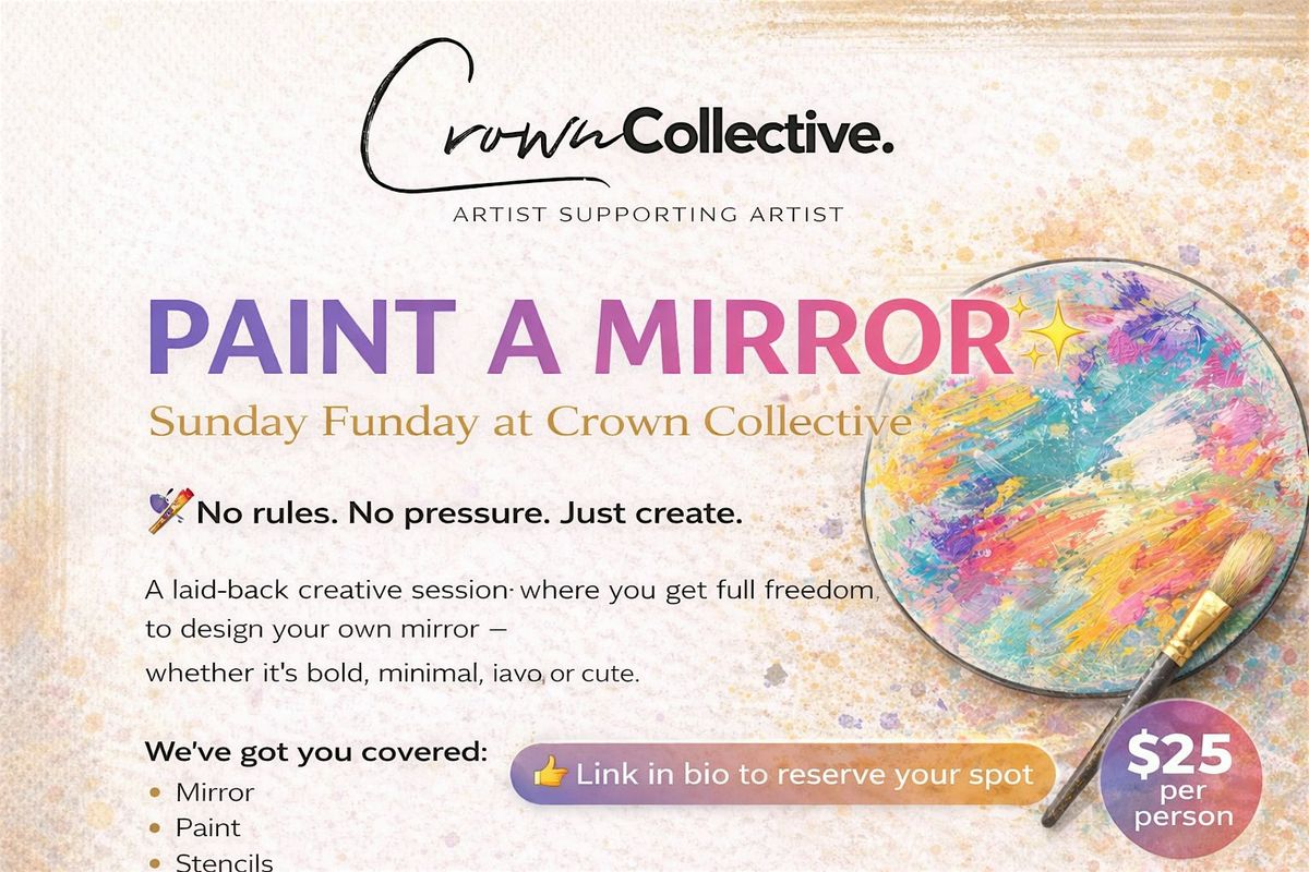 Join us for a relaxing day at Crown Collective located in Jasper Studios where you'll get to paint your own mirror! Whether you're a pro or just wanna have fun, this is the perfect way to spend your Sunday. We’re all about creating a relaxed, supportive space where artists (and non-artists) can connect, unwind, and make something personal.