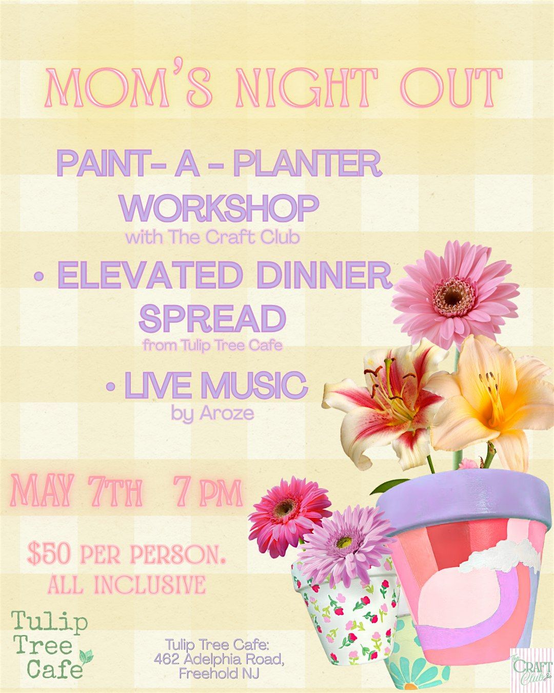 Grab your girls and join us for a Mom’s Night Out at Tulip Tree Cafe in Freehold, NJ ! 💐✨ Hosted by The Craft Club, this is your perfect excuse to unwind, get creative, and enjoy a night out 🤍