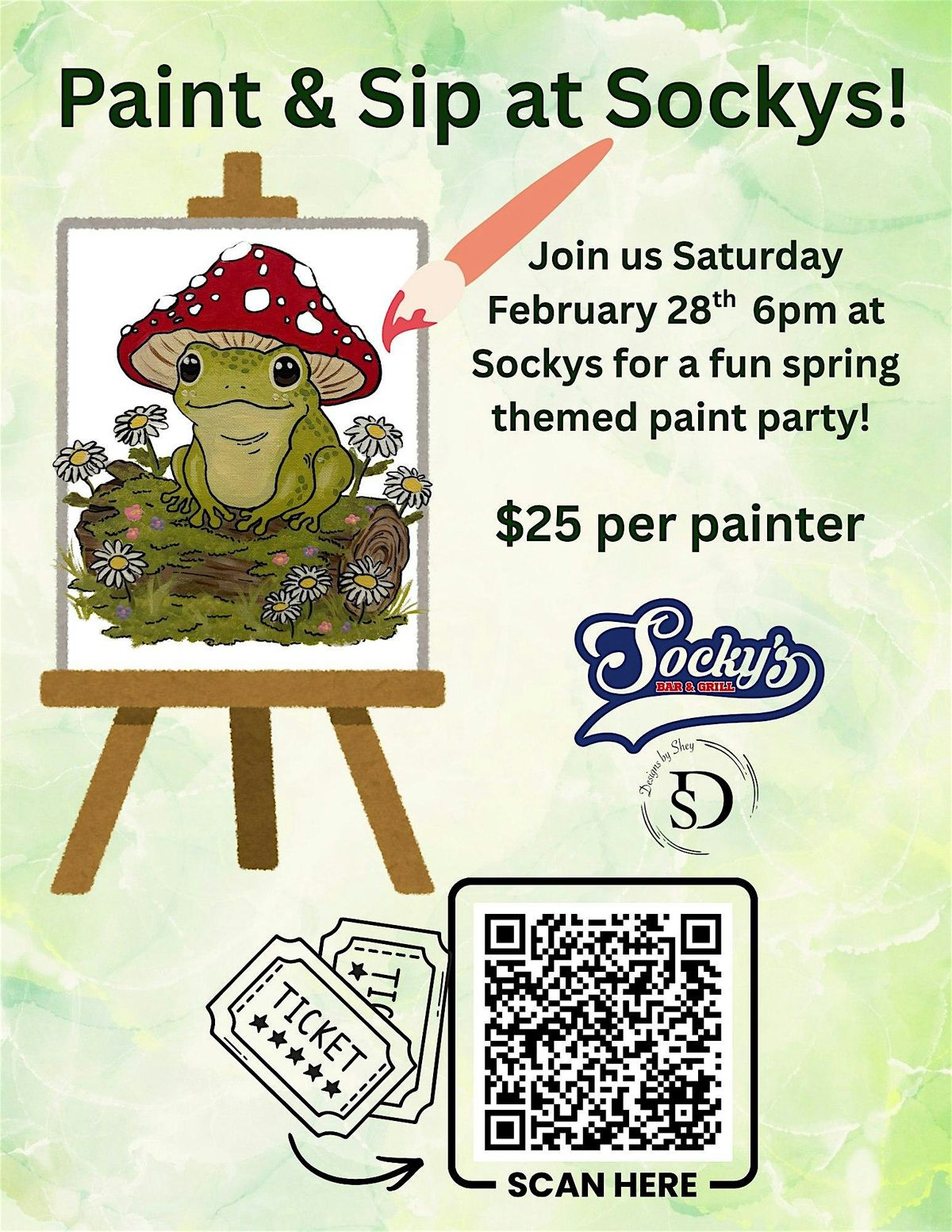 Join us for a super fun in-person event where creativity meets chill vibes! Grab a brush, sip on your favorite drink, grab your favorite food and let your inner artist shine at Sockys. Whether you're a pro or just looking to unwind and have a laugh, this is the perfect way to spend your evening. Don’t miss out on the fun, good company, and beautiful art you get to take home! This experience will include a step by step instruction on how to paint this super cute frog on his log. We paint on an 11X14" canvas! If this little frog intimidates you a little to paint from scratch, no worries, there will be a tracing option for this cute little dude! Sockys has a wonderful menu of drinks and food choices to purchase while we paint! We can't wait to see you there!!!