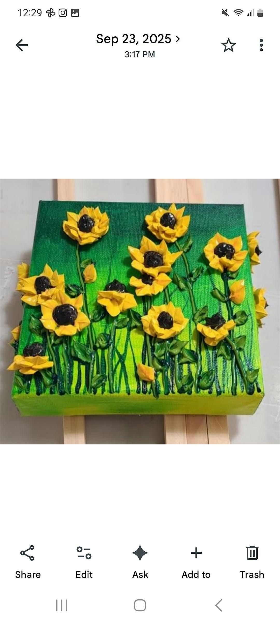 We'll be painting a 6x6 canvas with colored back ground and bright yellow sunflowers. I will teach you how to use frosting tips and bags to create heavy texture art. Experience not needed, a desire to learn and have fun is a plus. Can be messy, I'll have aprons, but you may want to wear something you don't care gets paint on it.