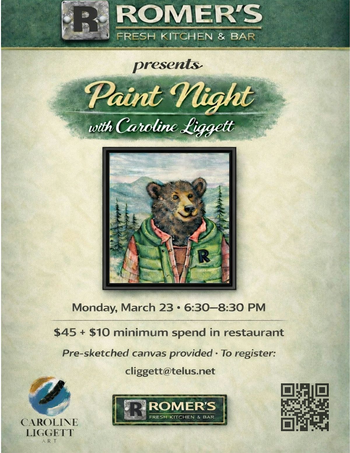 Info: Come dressed for mess or bring an apron. This is a pre-sketched 11" x 16" canvas and will be painted in a few easy steps. No sketching or painting experience necessary and you can modify the bear the way you wish perhaps painting your own initial on his puffer vest. I am a seasoned artist and love introducing people to the joys of painting and creating a social and fun atmosphere to do that. There is an expectation of a $10 spend in the restaurant.