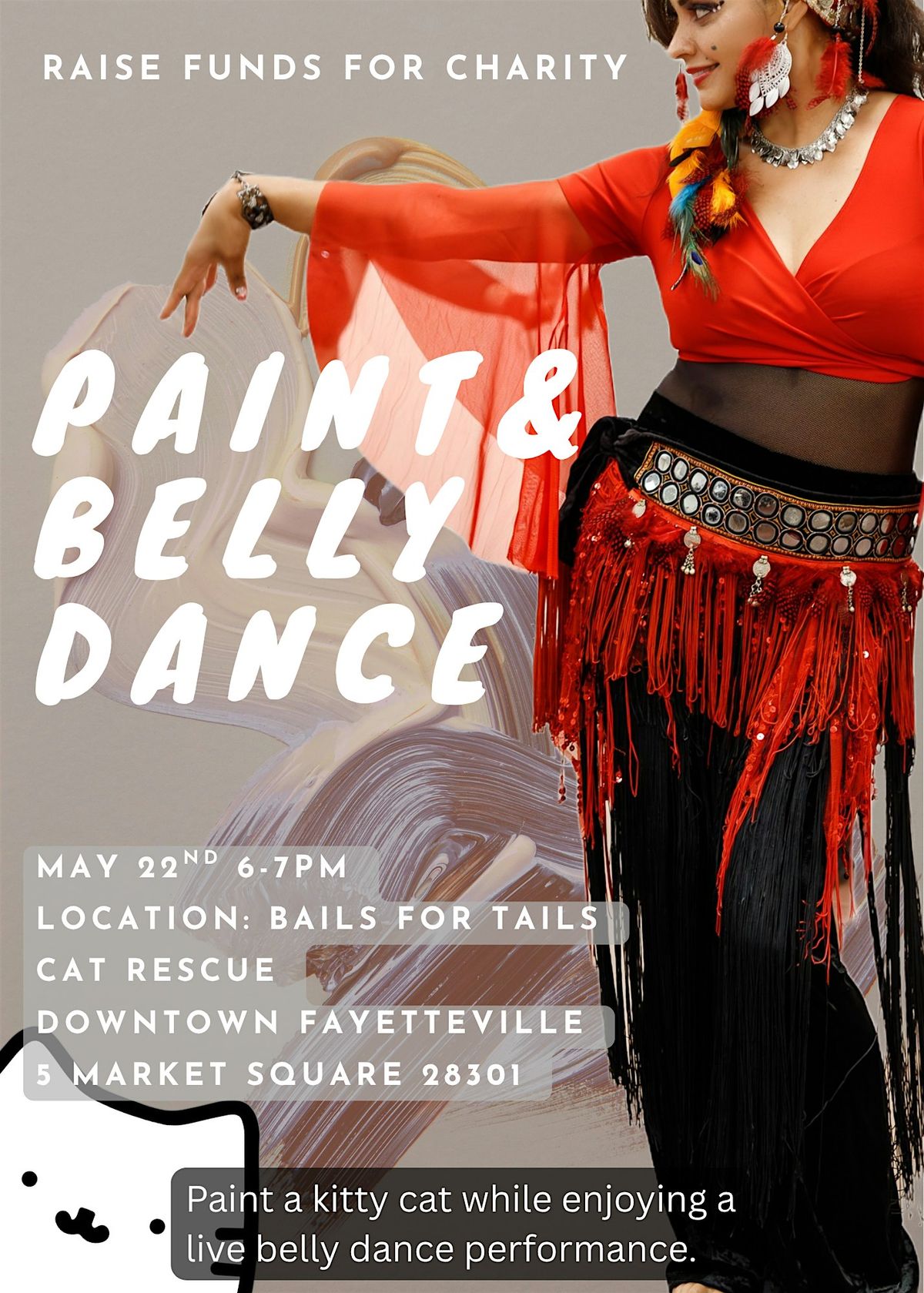 Help us support the kitties with some dance and painting. Tables will be set up outside with ready to paint kitty canvas and paint. While painting belly dancers will be dancing along the streets.