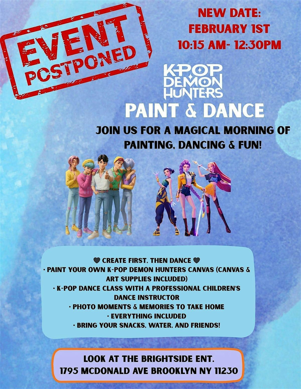 Join us for a magical morning of creativity and movement! Kids will enjoy a fun, easy K-pop dance session followed by movie-themed canvas painting featuring a pre-drawn K-Pop Demon Hunters character.