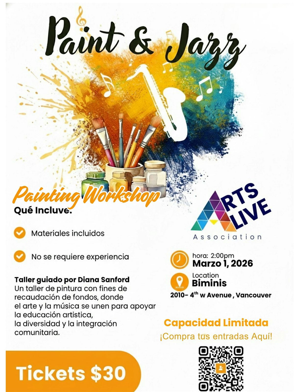 Te invitamos este domingo 1 de marzo de 2026 a las 2:00 PM en Biminis (2010 W 4th Ave, Vancouver) a disfrutar de una tarde creativa llena de pintura, música y buena energía.