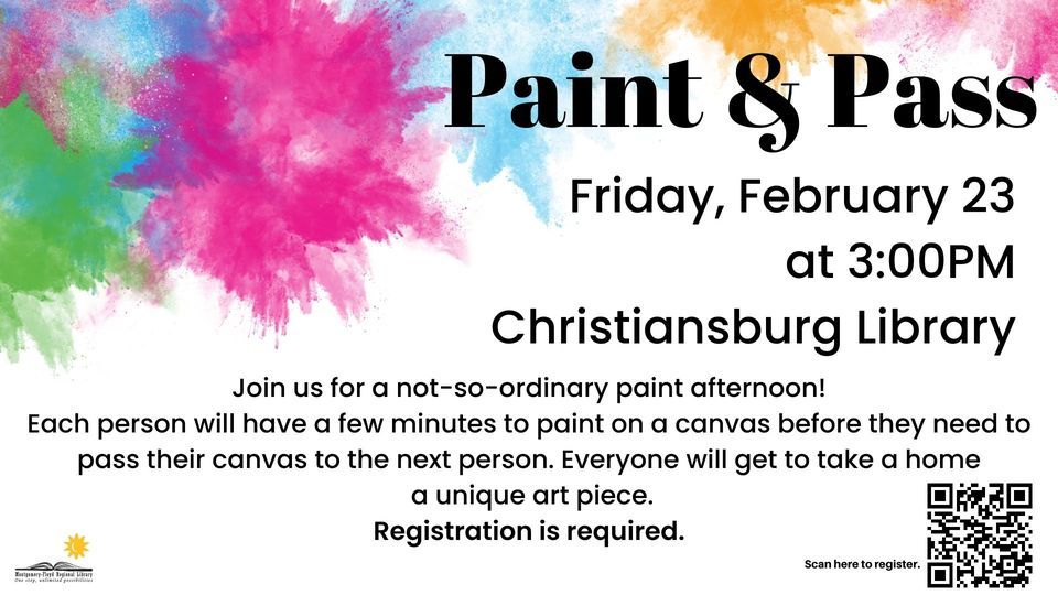 Join us for a not-so-ordinary afternoon of painting! Each person will have a few minutes to paint on a canvas before they pass their canvas to the next person. Everyone will get to take a home a unique art piece. Registration is required. https://mfrl.libcal.com/event/10906757?hs=a