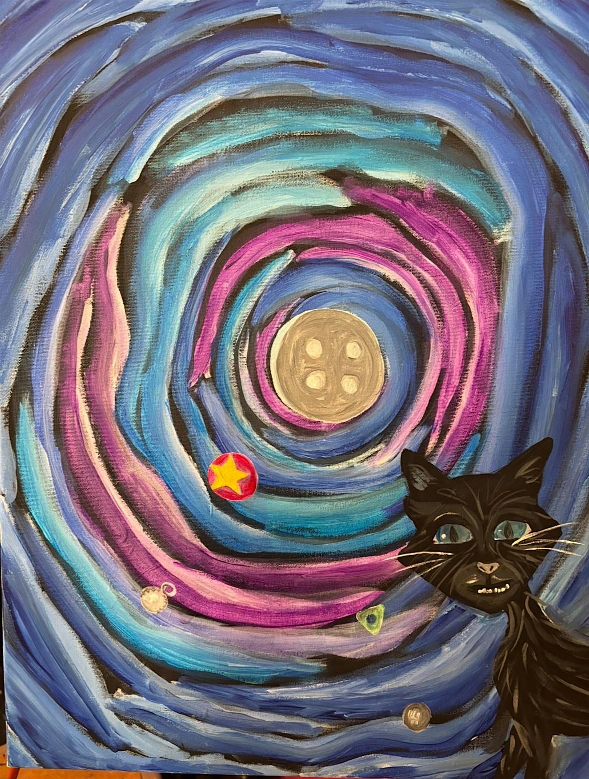 Join us for a Paint & Drip movie night featuring Coraline and this cool, colorful painting to go with it.