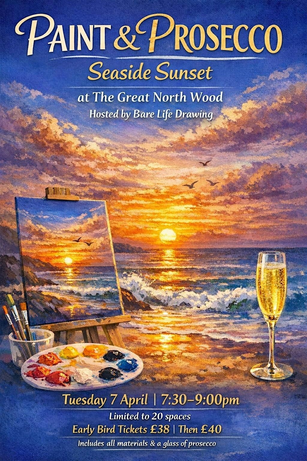 Welcome to Paint & Prosecco at The Great North Wood! Join us on April 7, 2026 at 7:00 PM for a fun evening of creativity and relaxation. Grab a paintbrush, sip on some Prosecco, and let your artistic side shine!