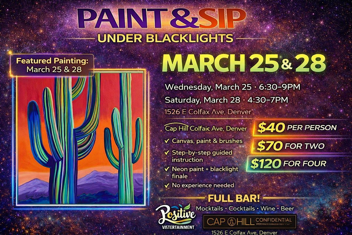 Glow Paint & Sip under blacklights! March 28 at Cap Hill Confidential. Neon art + full bar. Reserve your seat today!