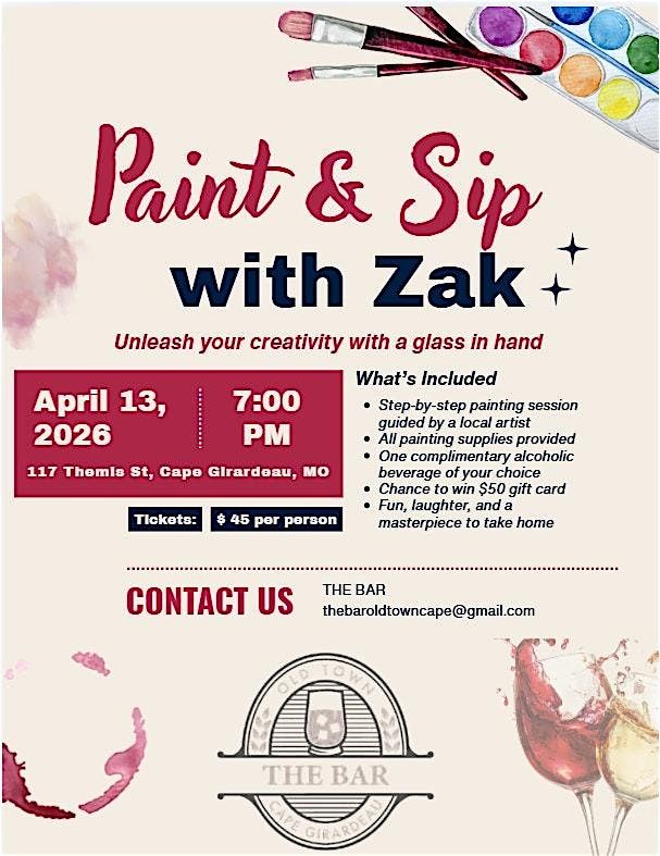 Ready for a chill evening of creativity and fun at THE BAR? Our Paint & Sip event with Zak is the perfect spot to unwind, grab a drink, and let your artistic side shine. Whether you're a seasoned painter or just looking to try something new, this in-person gathering is all about good vibes, great company, and awesome masterpieces. Bring your friends, sip your favorite beverage, and create some memories with us! Included in the ticket price is one alcoholic beverage and chance to win a $50 gift card to THE BAR!