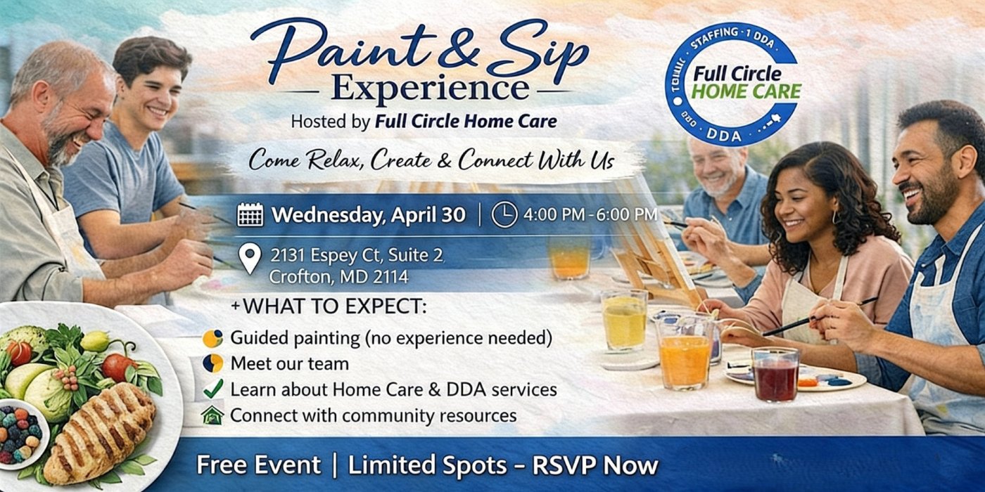 Join Full Circle Home Care for a relaxing Paint & Sip Experience! Enjoy a guided painting session, connect with our team, and learn about our Home Care and DDA services while building meaningful community connections.