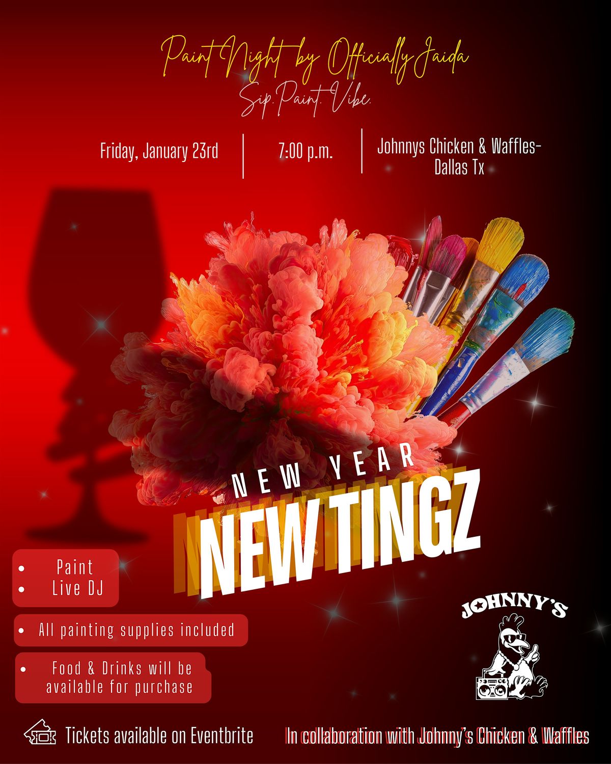 Kick off the new year with a fun, laid-back paint night at Johnny’s Chicken & Waffles! Join us for an evening of creativity, good vibes, and great food in a lively atmosphere.
