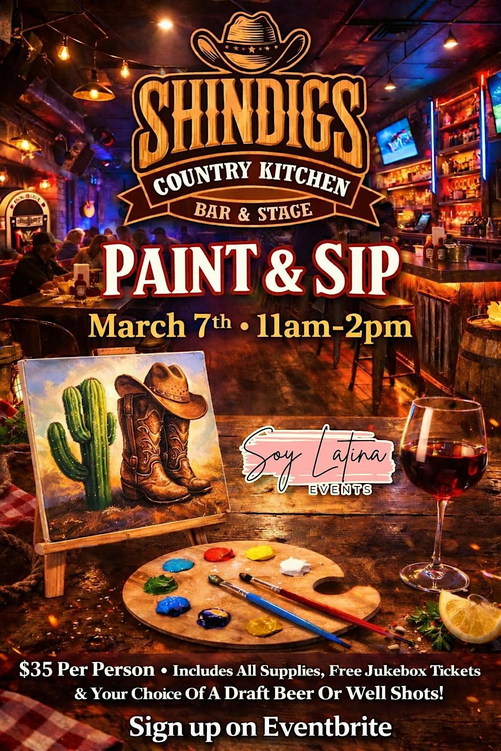 Grab your amigas (or your boo) and join us for a fun western-inspired Paint & Sip at Shindigs Country Kitchen Bar & Stage