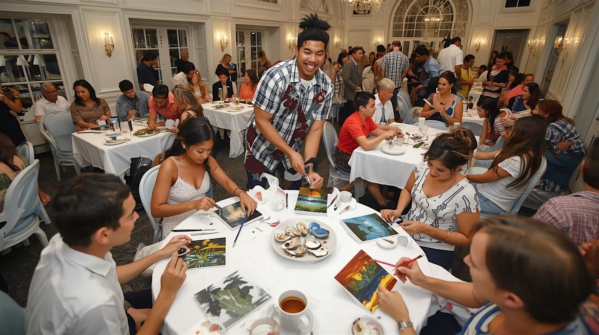 Your ticket includes all paint supplies and canvases as well as one complimentary fresh oyster per guest. Special happy hour pricing on additional oysters, ceviche, fresh poke and other delicious artisan snacks.