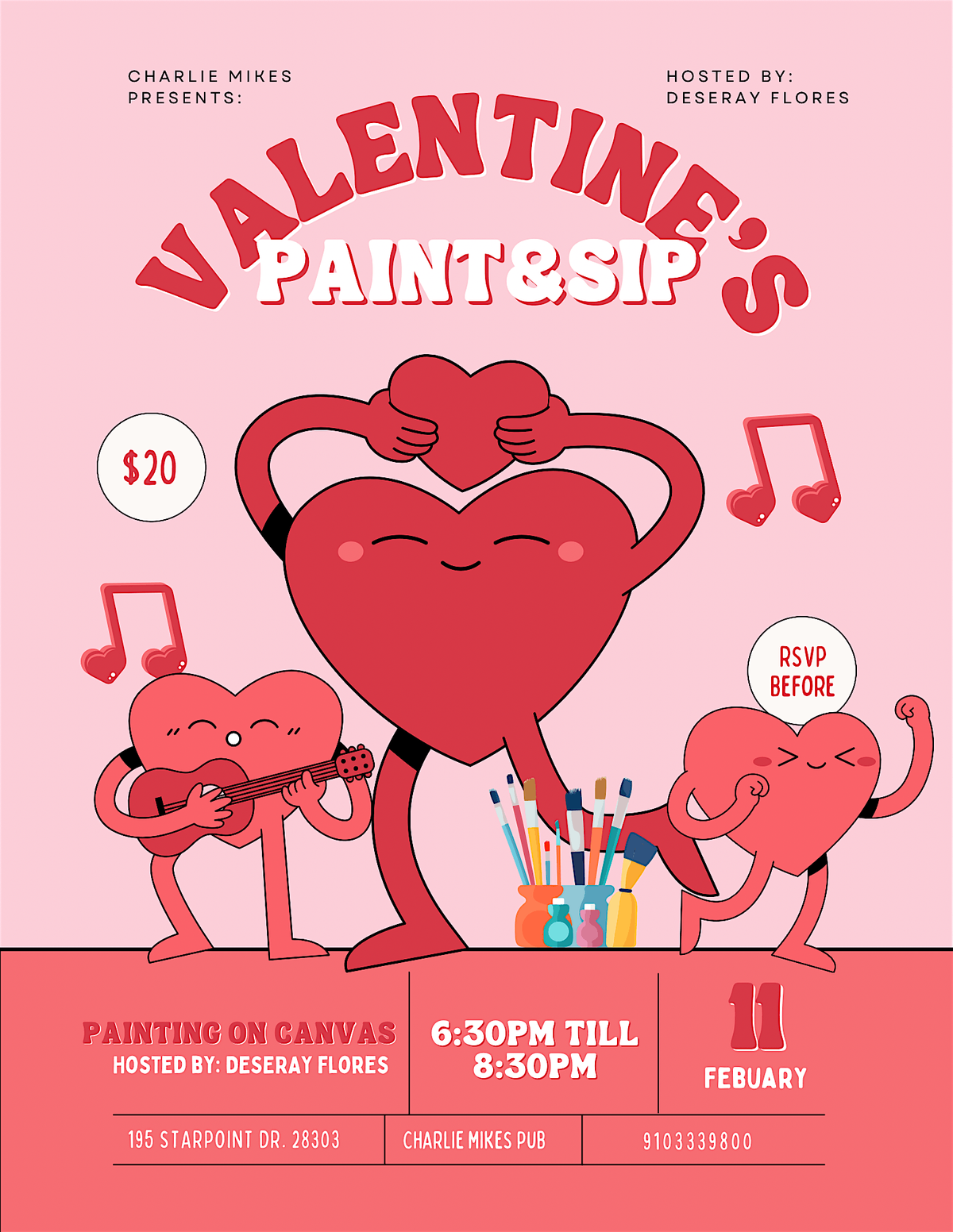 Ready for a fun night out? Join us in person at Charlie Mikes Pub for an evening of painting and sipping your favorite drinks. No fancy skills needed—just bring your creativity and get ready to have a blast! It’s the perfect way to unwind, meet new people, and let your inner artist shine. Don’t miss out on this chill, artsy night!