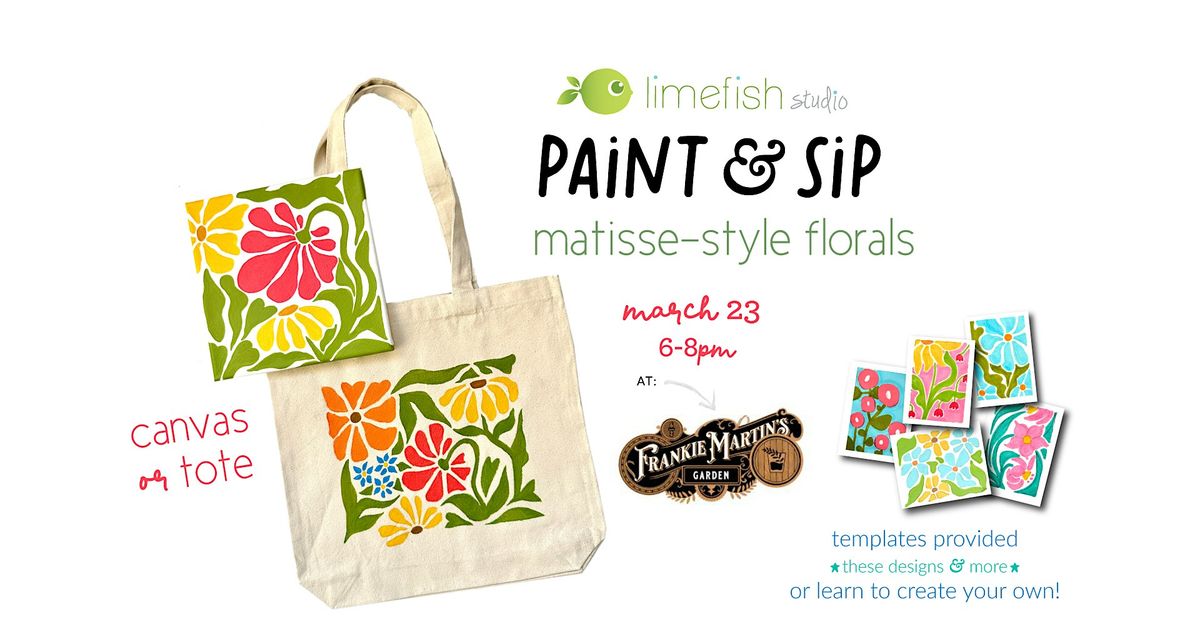 This Paint & Sip class is inspired by Matisse-style Art Nouveau: simplified forms, vibrant color palettes, and flowing decorative nature patterns.
