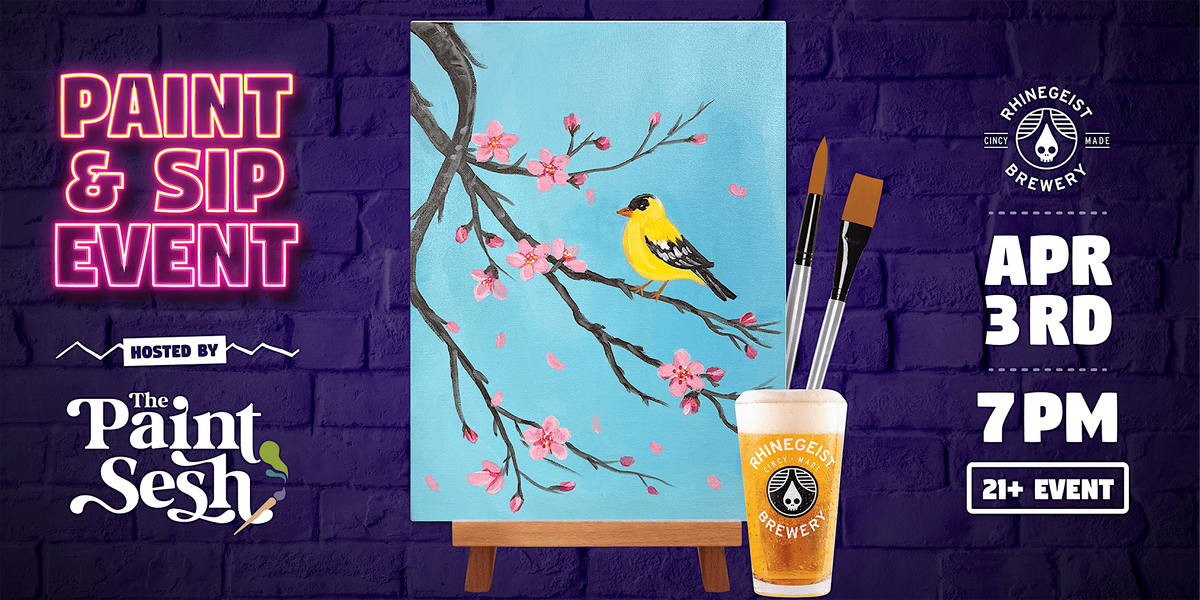 Celebrate the shift into spring with a bright, uplifting paint and sip in Cincinnati at The Paint Sesh. For this event, we’ll be painting “Finch in Bloom,” a cheerful spring-inspired design featuring a sweet finch surrounded by fresh florals and soft seasonal color. It’s light, happy, and full of that everything’s-coming-back-to-life energy.