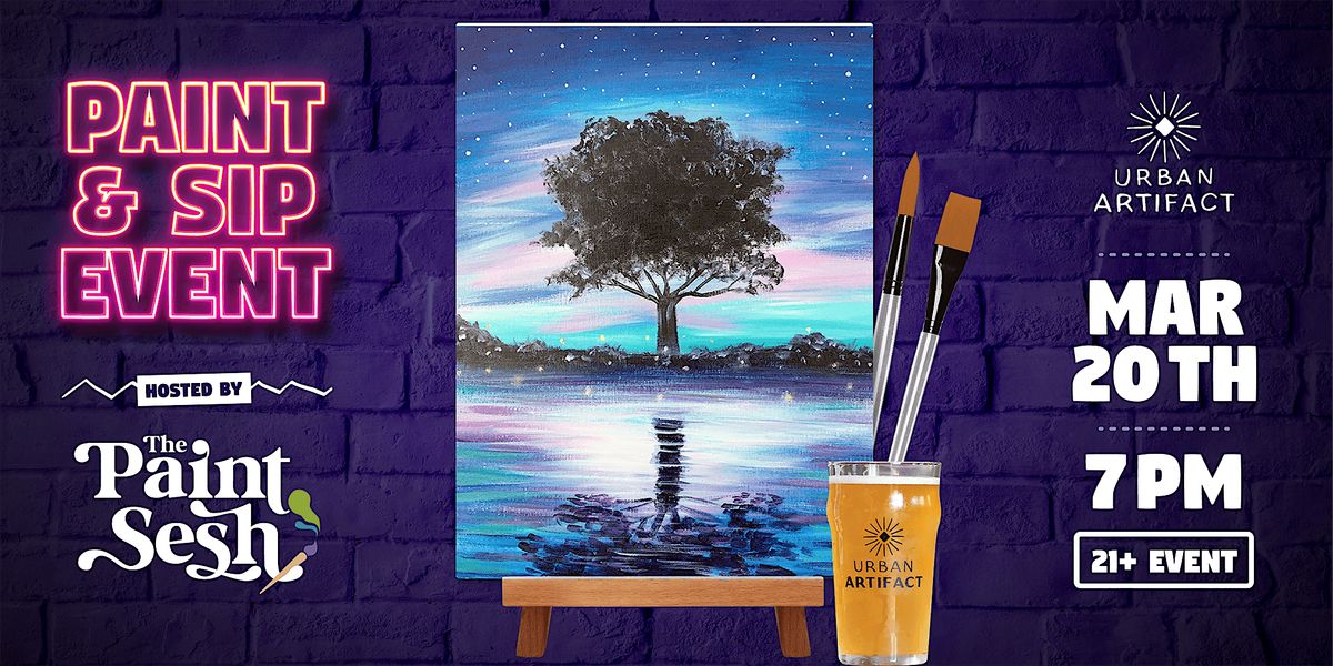 Slow things down and sink into a calm, creative night out at this paint and sip in Cincinnati, hosted by The Paint Sesh. For this session, we’ll be painting “Reflections,” a serene nightscape featuring a solitary tree mirrored across glowing water—soft color blends, gentle movement, and a peaceful, almost meditative vibe.