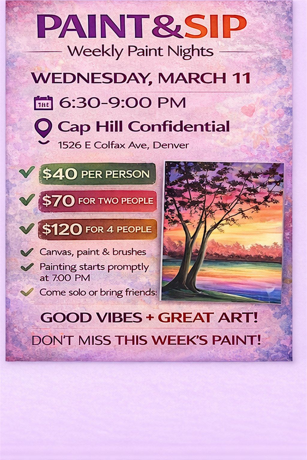 Looking for a fun night out? Join us for a guided paint + sip experience with music and great vibes — no experience needed.