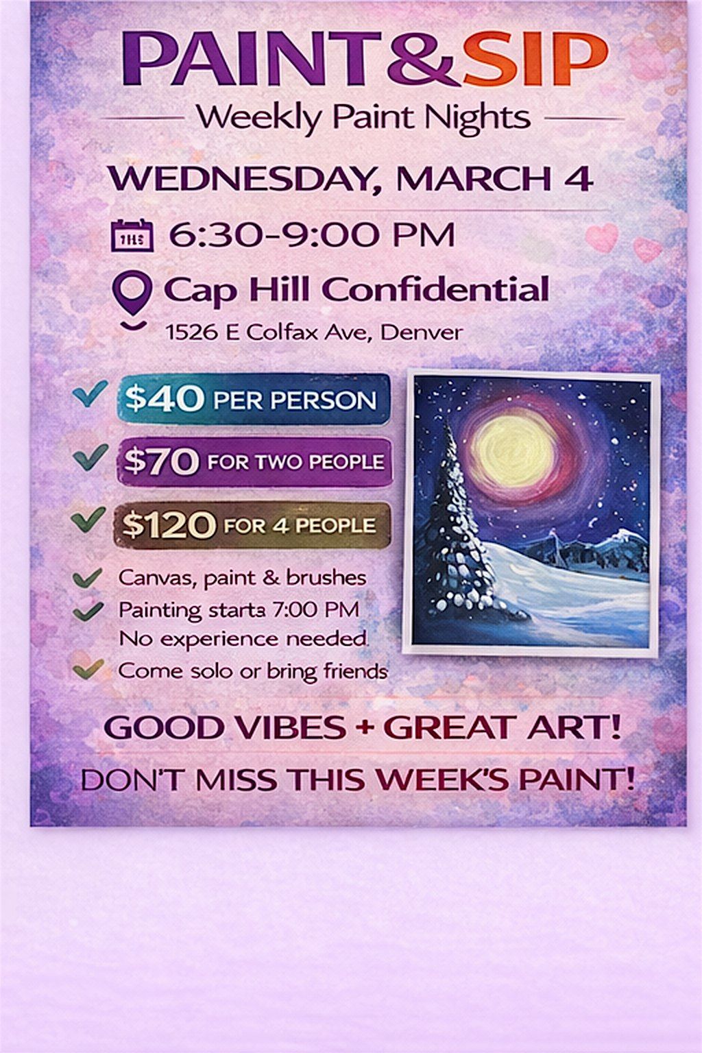 Looking for a fun night out? Join us for a guided paint + sip experience with music and great vibes — no experience needed.