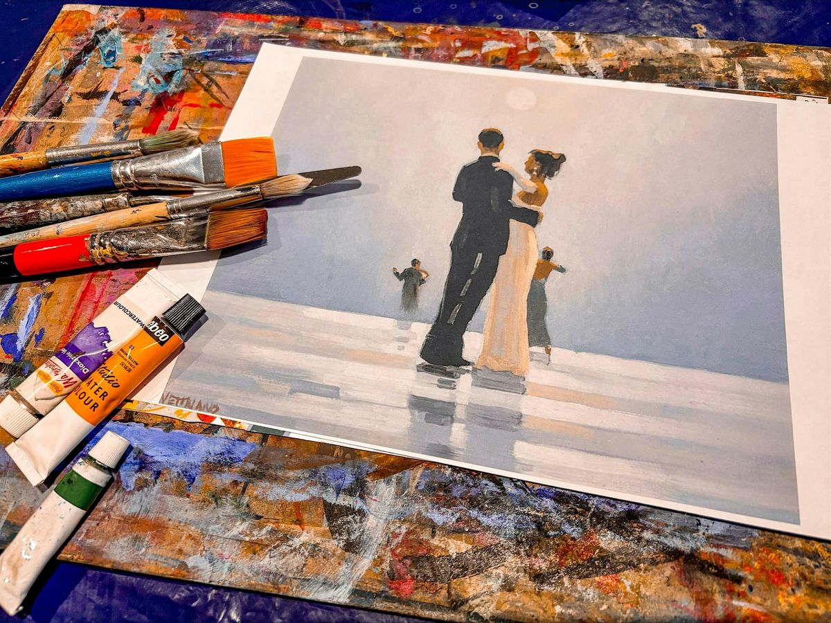 Paint Jack Vettriano’s Dance Me to the End of Love in a relaxed evening class. All materials, drinks & snacks included. No experience needed