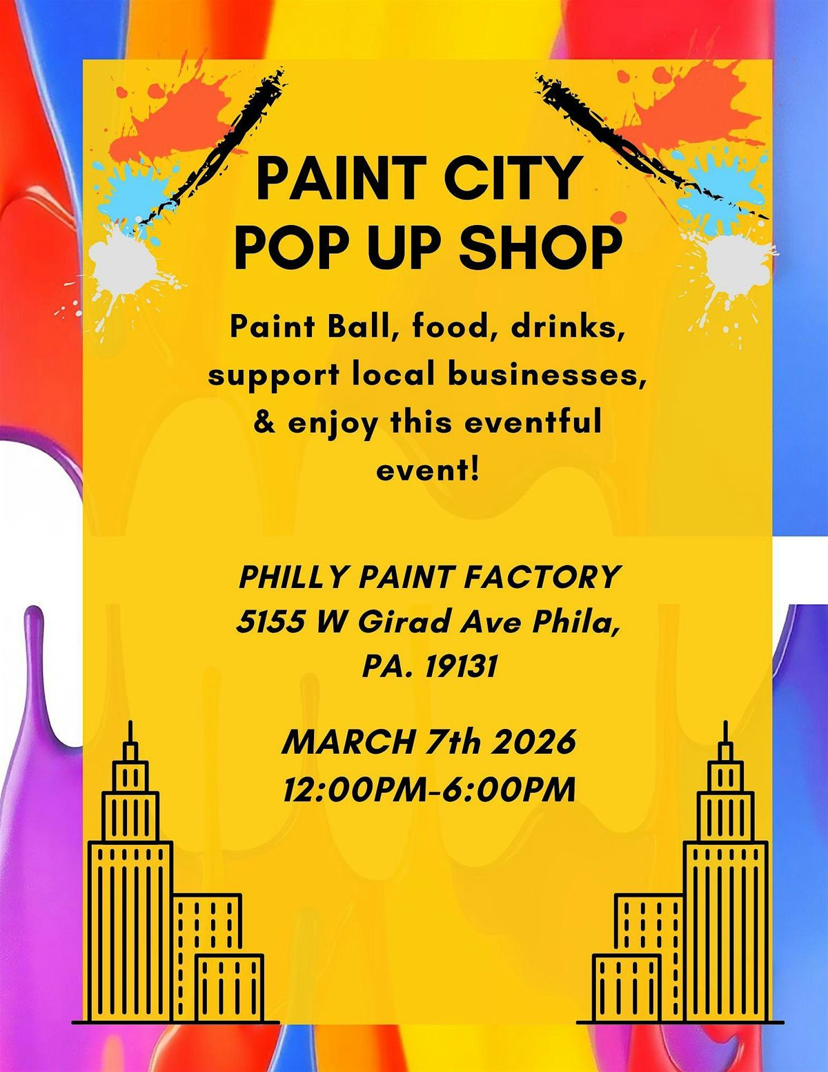 PAINT CITY POP UP SHOP! COME SUPPORY LOCAL BUSINESS, FOOD AND DRINKS! PLEASE CALL OR TEXT 267-850-6839 WITH ANY QUESTIONS.