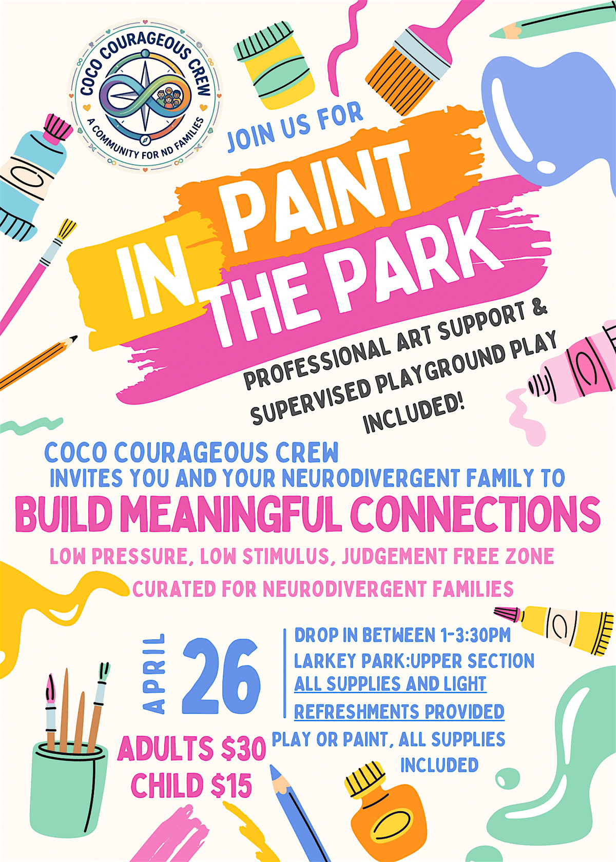 Join us in person for a fun-filled day of creativity and connection! This event is perfect for neurodivergent kids and their families to relax, paint, and enjoy the great outdoors together. No stress, just lots of colors and good vibes. Bring your imagination and let’s make some art in the park!