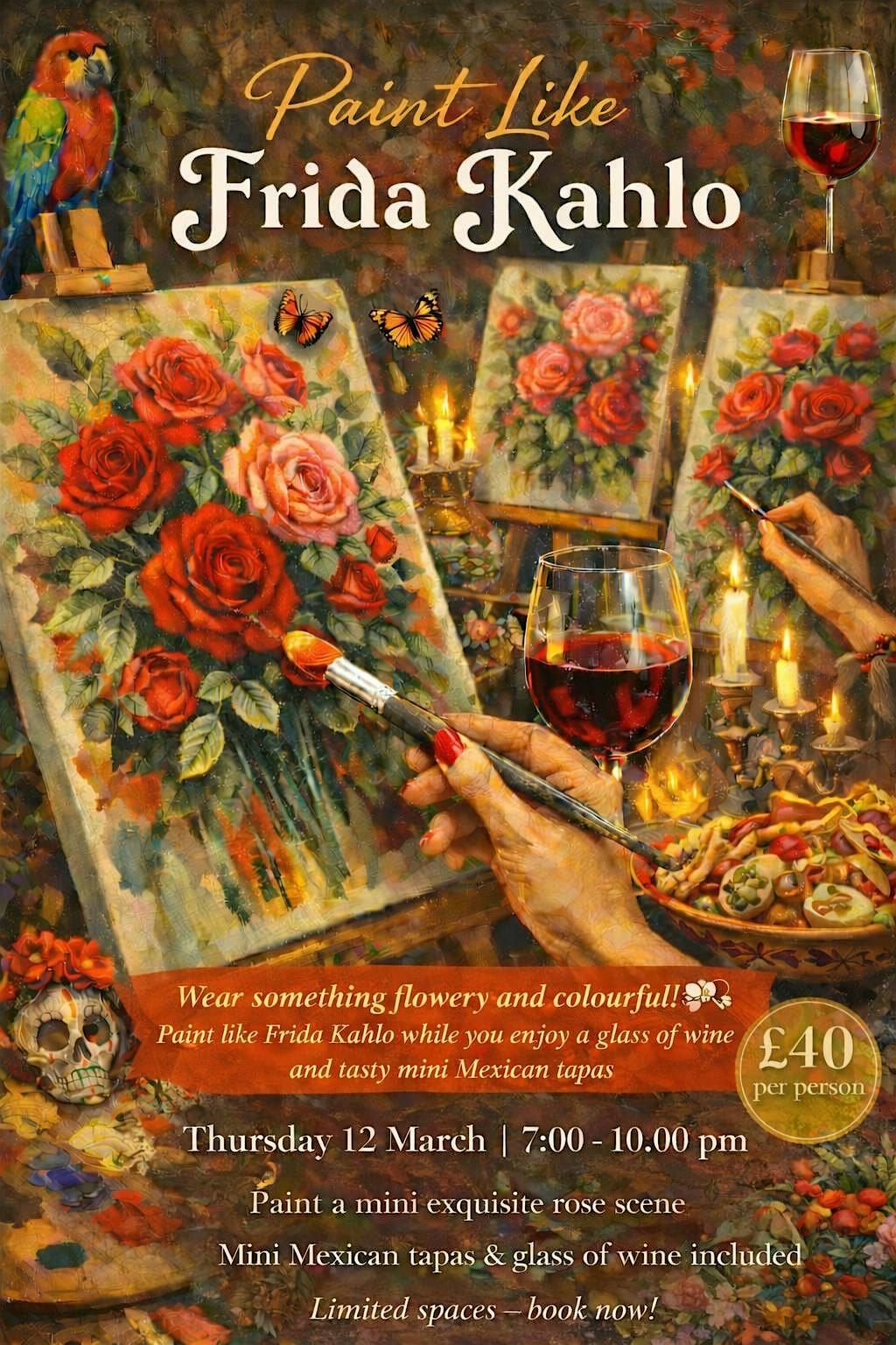 Wear something floral and colourful if you wish and settle in for a fun, atmospheric night of creativity, wine and good company.