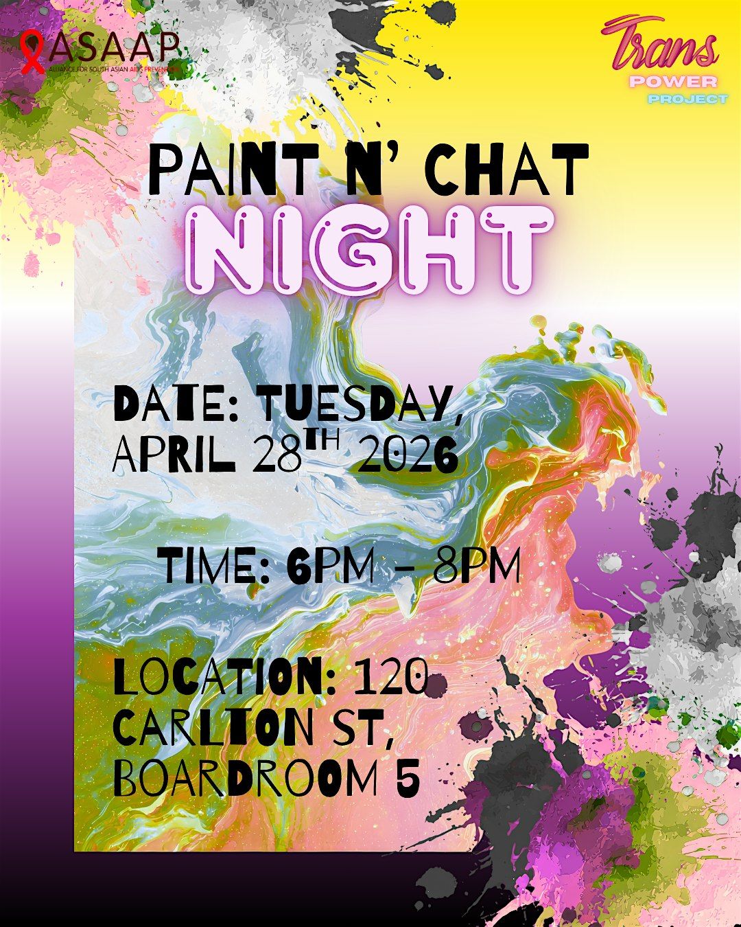 Join us for a night of painting and chatting. This peer support group is for BIPOC Trans newcomers, refugees, and immigrants.