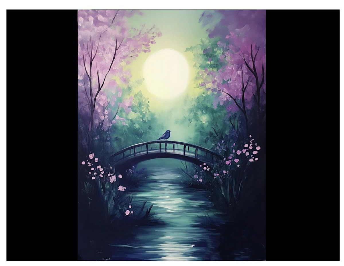 Paint n Sip Evening: "Bird On Bridge". Get ready for an inspiring night of creativity with the professional artist Monica Higgins! With over 30 years experience and having led hundreds of sessions inspiring all students feeling happy and fulfilled creatively. Monica will guide you in a step by step easy to follow method while you create your very own masterpiece.