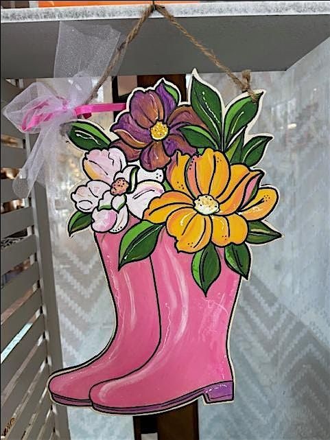 Start with a prelined wood cutout...choose your fav paint colors, and create a masterpiece. We will then add some resin poured to make those boots shiney just like the vintage rubber. All instruction and supplies are included along with a lunch snack a mimosa and bottle water so you can manage this fun 1.5 hour class!!