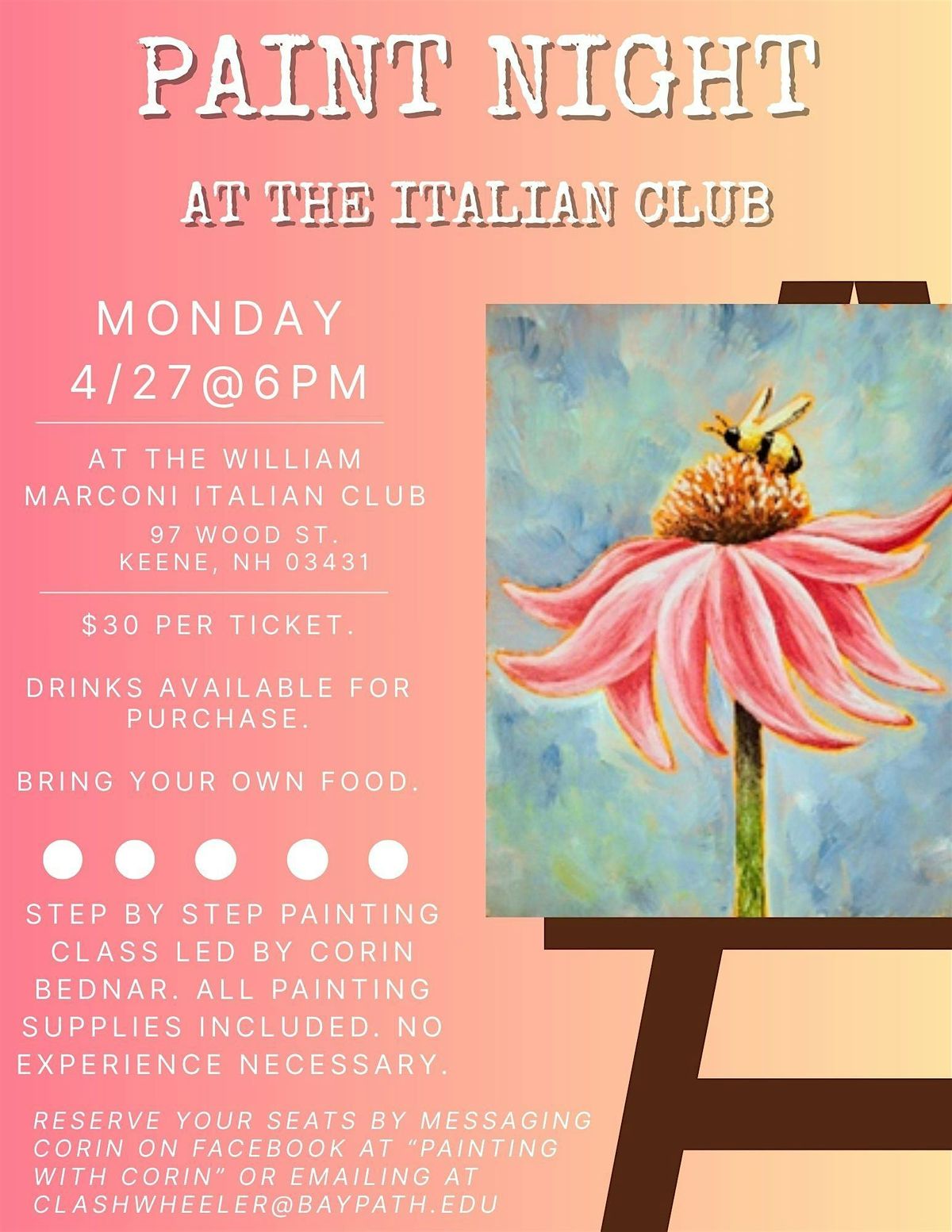 Get ready for a fun-filled evening at the Italian Club! Join us in person for a relaxed Paint Night where creativity meets good vibes. Whether you're a pro or just want to try something new, we've got all the supplies ready for you. The instructor, Corin Bednar, will teach you how to paint this beautiful flower and honeybee with step-by-step instructions. Bring your friends, grab a drink, and let's make some colorful memories together. Don't miss out on this awesome night of art and laughs! $30 per ticket. Drinks available for purchase. Feel free to bring your own food. Message Corin with any questions. See you there! :)