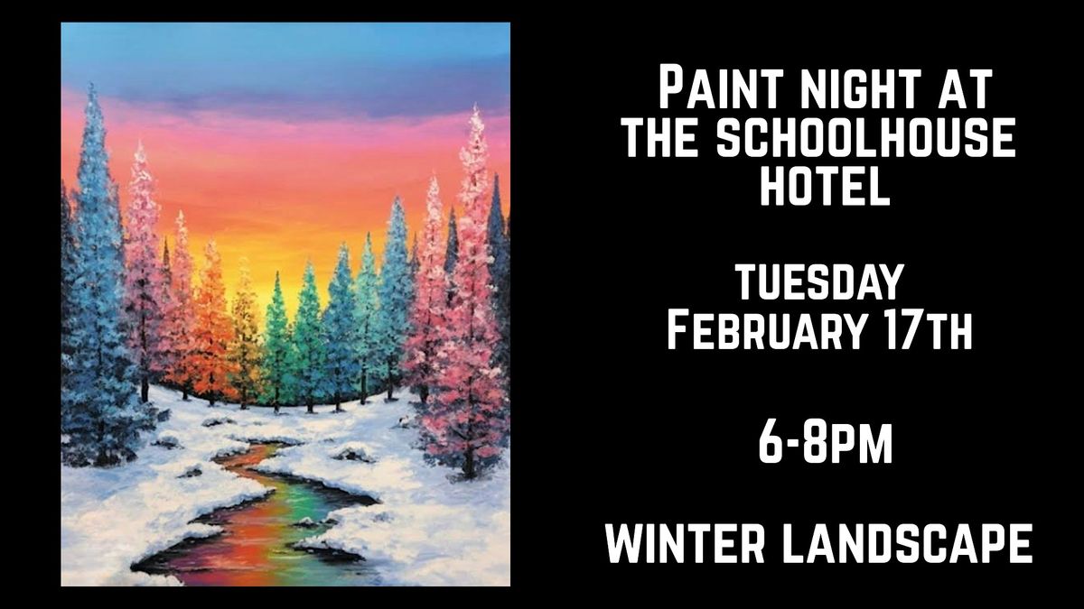 Come on out for a fun evening Paint Night at The Schoolhouse Hotel in White Sulphur Springs painting a winter landscape! $35/person includes all materials and step-by-step instructions including paints, apron, easel & a 16x20 inch canvas. This class is beginner friendly and for adults and kids 10+ years and older. Food and drinks will be available for purchase (no outside food or drink allowed). Must be 21+ to purchase and/or consume alcohol. Come out for a fun evening with a paint brush in one hand and tasty beverage in the other! **Any cancelations less than 24 hours in advance will be given credit towards a future event- Eventbrite fee is nonrefundable