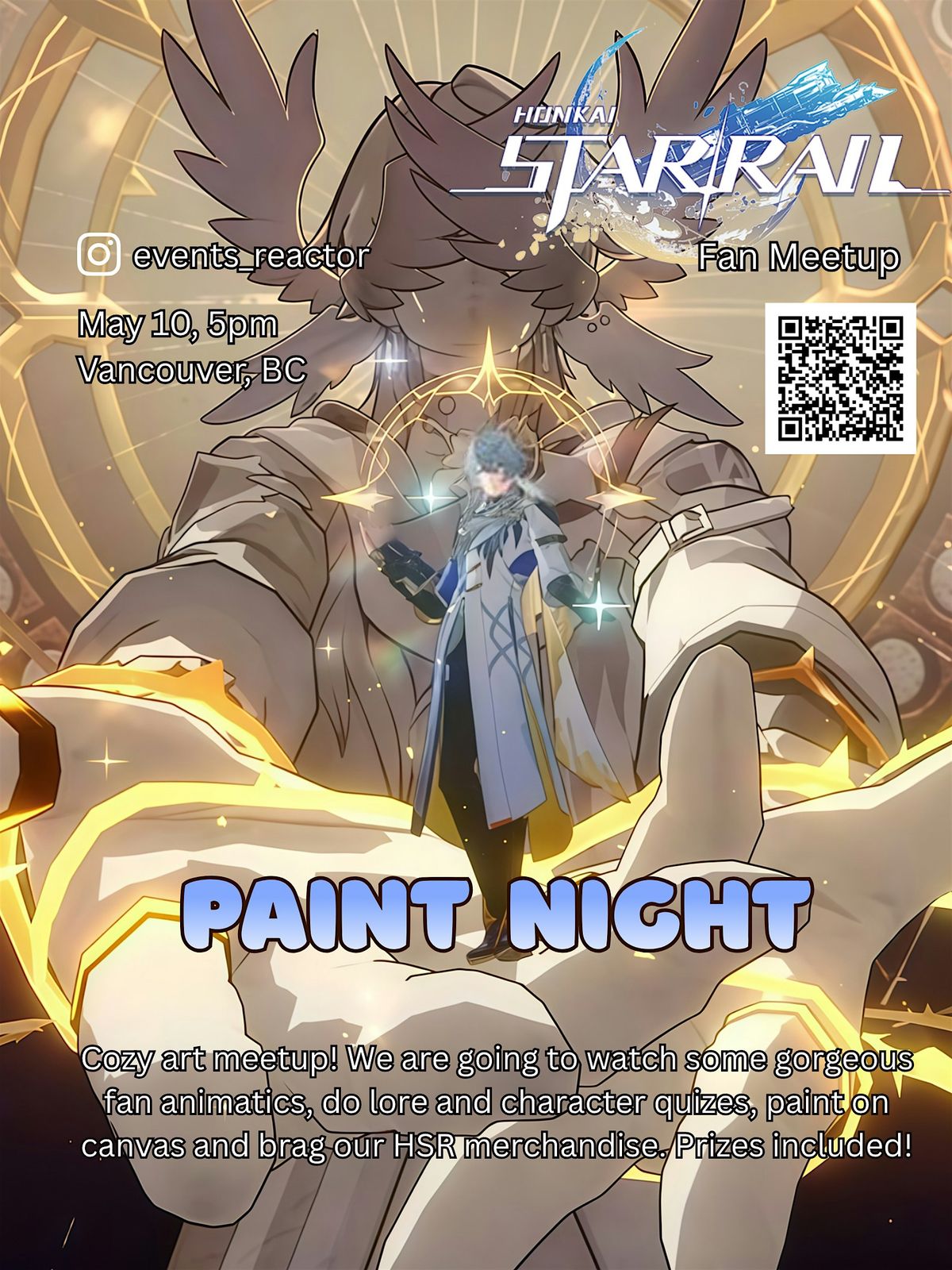Come to paint with us :) You are free to paint any of the characters, any aesthetic scenery or anything that reminds you of our beloved fandom ❤ The studio is going to provide all the materials (pains, canvas, brushes etc) and some drinks. We also would love to share and watch some of the famous animatics and do fun quizes to check how well you know the lore and the characters. You will probably know something new about HSR :)