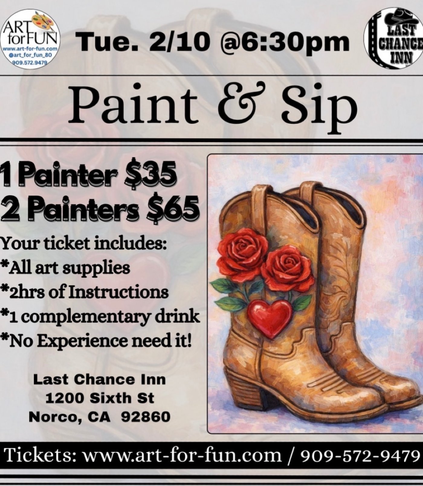 Paint, sip, and unwind! Step into a colorful evening filled with art, drinks, and feel-good energy. No experience needed—just bring your creativity to this 2-hour guided paint class designed for all skill levels and perfect for making memories with friends and family.