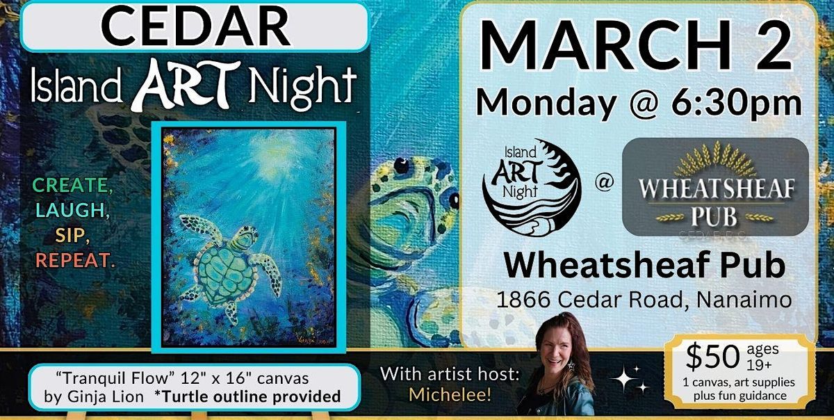 Take the night off with some friends, and unwind with us at The Wheaty. Michelee will guide you step-by-step, as you create your own version of this beautiful new painting by Ginja. "Tranquil Flow" invites you to find your own flow, as you tap into your creativity. We make it fun and easy for anyone to paint a picture, you'll be surprised! Space is limited though, and these events often sell out, so call your friends and get your tickets now. Arrive early to enjoy the menu too, and we look forward to painting with you soon!