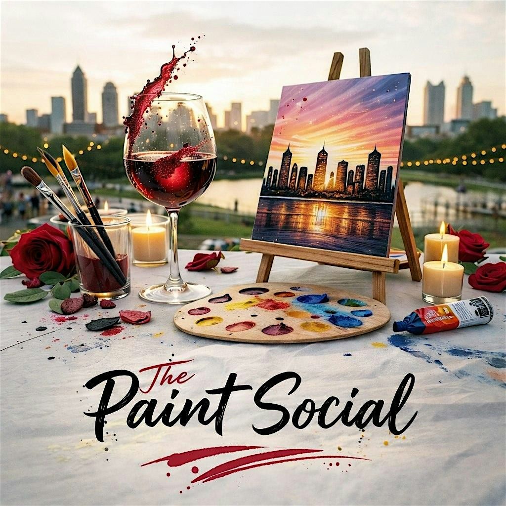 Unwind with drinks and brushes while capturing a stunning sunset skyline on canvas.