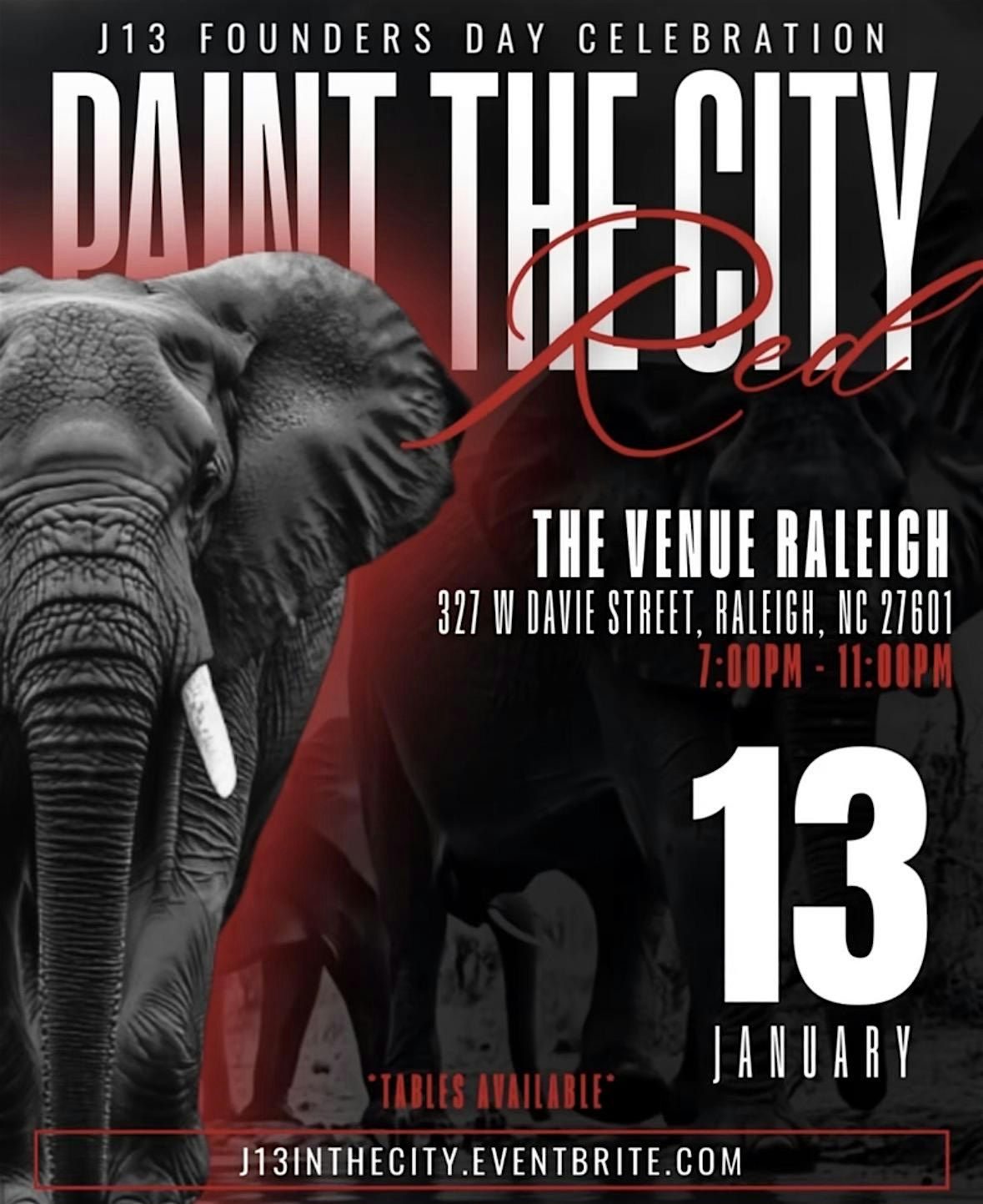 Welcome to Paint the City RED: A J13 Founders Day Celebration! Join us at The Venue Raleigh on January 13, 2026 at 7:00 PM (Eastern Time) for a night to remember. Let's celebrate this special day in style with music, dancing, and great company. Don't miss out on the opportunity to connect with fellow sorors, other D9 members and make lasting memories. Get ready to paint the city RED with us!