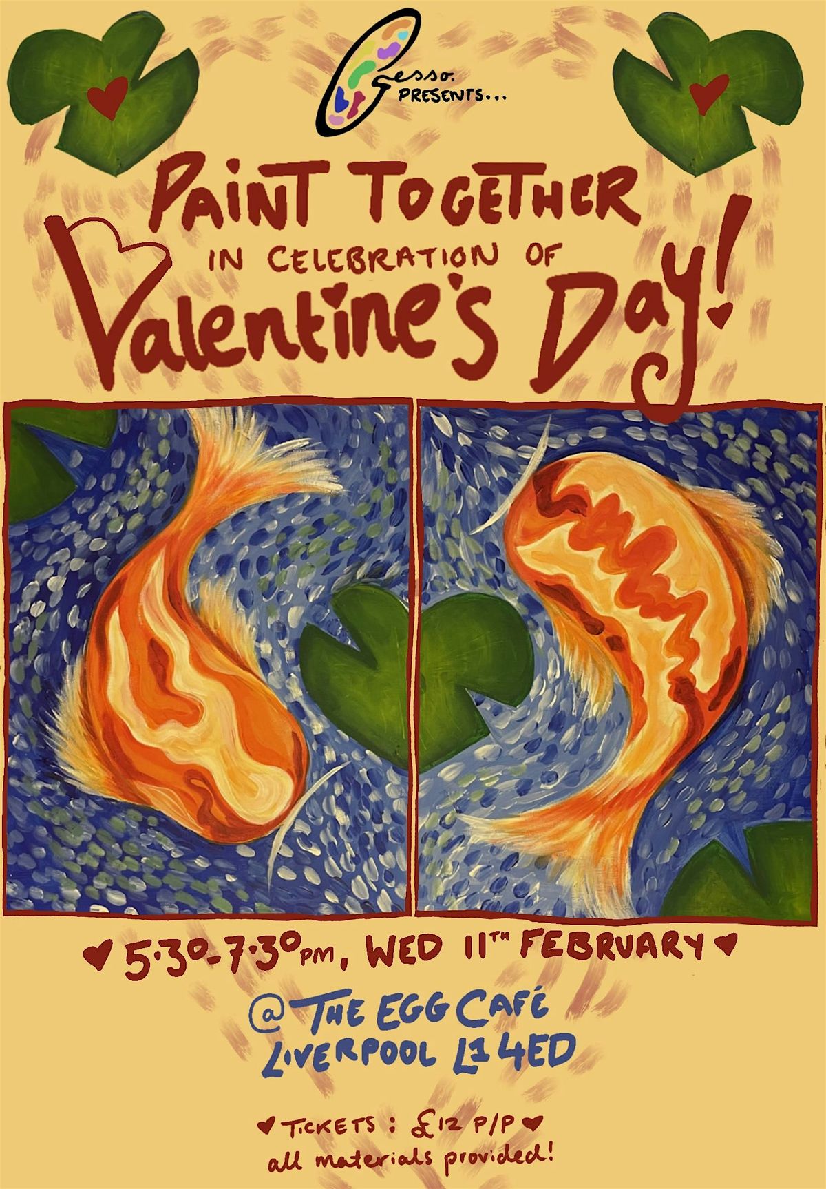 Join Gesso for a night of Creativity, Drinks and Romance as we guide you through this beautiful koi pond collaborative piece! Work alongside your lover, bestie or most beloved to complete a perfect pair of paintings!