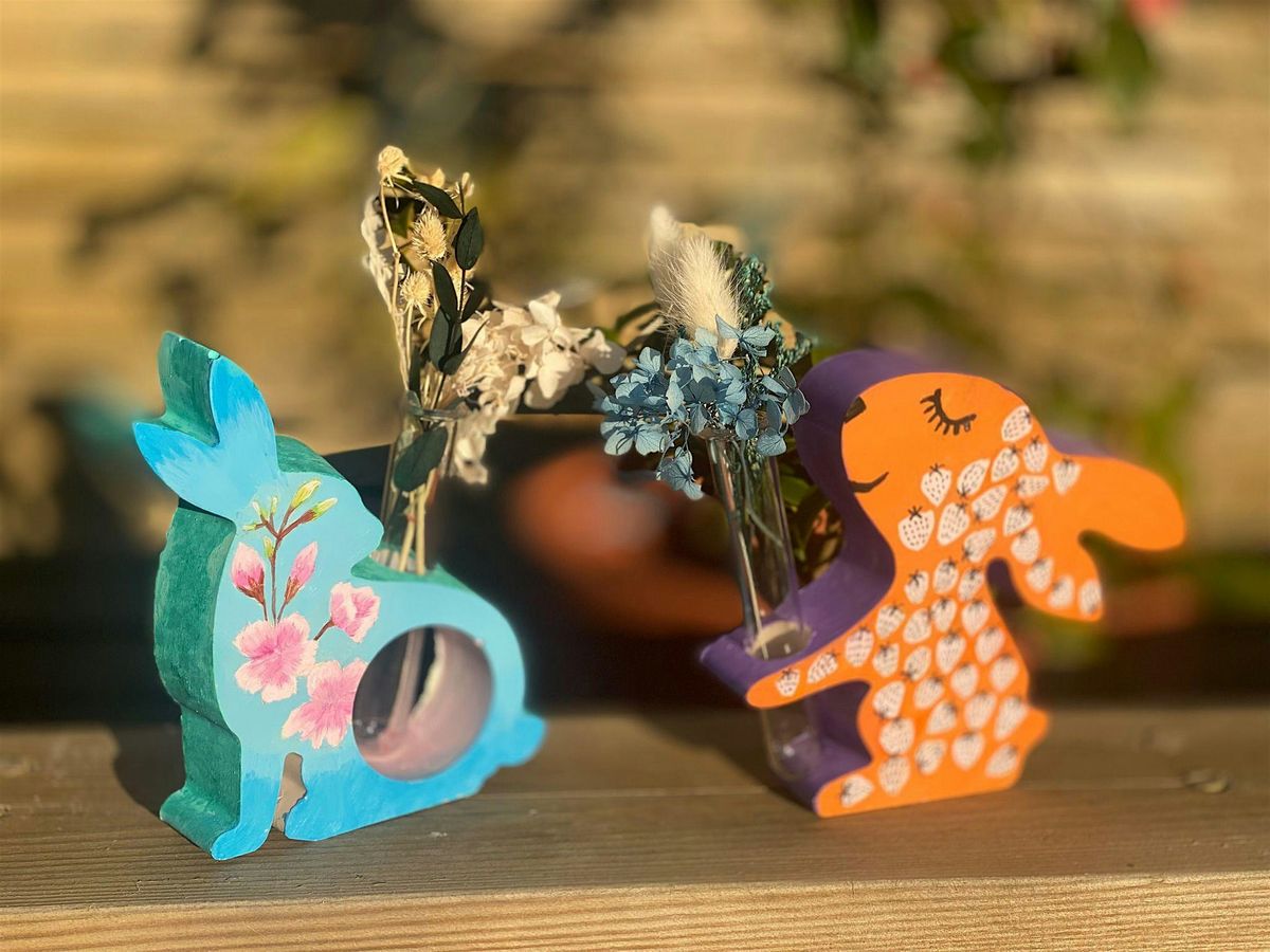 You will have all materials: a bunny stand, a tube vase, a tiny bundle of dried flowers, acrylic paints and brushes etc.