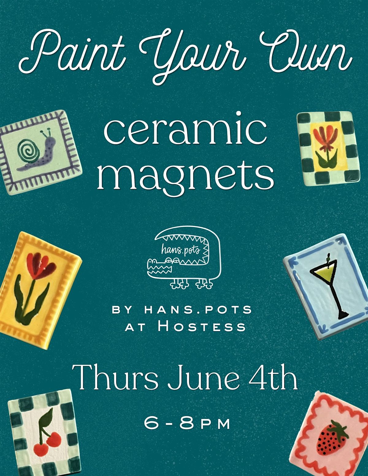Join us for a fun and cozy workshop painting your own handmade ceramic magnets, guided by Hannah Lawson from Hans.Pots! Bring your creativity, sip and shop around Hostess, and make new friends while creating a unique piece to brighten your space. You will learn application techniques and hand-paint 3 magnets with real ceramic glazes. Hannah will take your piece to be fired in the kiln and they will be ready for pickup in about a week. Open to all skill levels, no experience needed :)